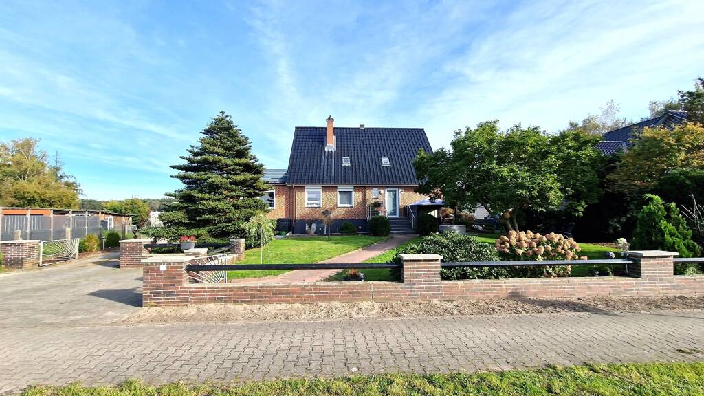 Das Haus erstreckt sich über ein gepflegtes Grundstück mit einem Nebengebäude, welches eine Garage und ein großes Carport umfasst. Das Carport bietet viel Platz für ein Fahrzeug und schützt dies zuverlässig vor Witterungseinflüssen. Der Garten auf der Ostseite lädt zum Entspannen ein und ist über den Flur und die Nebeneingangstür vom Haus aus zugänglich.