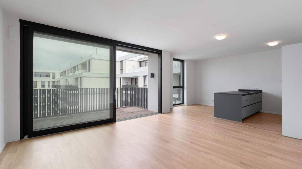 Wohnzimmer mit offener Küche - Große Fensterfronten mit Südwestausrichtung - Mehrschichtparkett - voll ausgestattete Küche mit hochwertigen Elektrogeräten