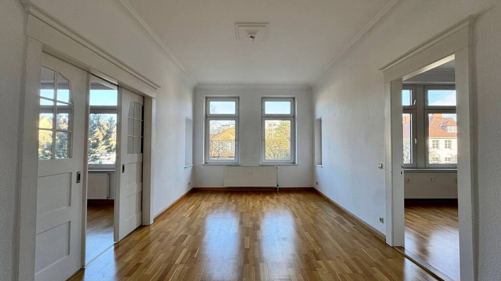 In einem gepflegten Altbau präsentiert sich diese großzügige 3-Zimmer-Wohnung im 1. Obergeschoss. Auf ca. 105 m² Wohnfläche überzeugt die Wohnung mit einem durchdachten Schnitt, besonderen Raumverbindungen und viel Tageslicht. Zwei der Zimmer sind durch eine praktische Schiebetür miteinander verbunden – ideal als kombinierter Wohn- und Essbereich oder zur Nutzung als Wohn- und Arbeitszimmer. Das dritte Zimmer ist vom Flur aus begehbar und eignet sich hervorragend als Schlafzimmer. Angrenzend befinden sich das Badezimmer sowie der Balkon mit Blick in den Innenhof. Das Badezimmer ist hell gefliest und verfügt über eine Dusche sowie eine Badewanne. Das WC ist separat untergebracht und sorgt so für zusätzlichen Wohnkomfort. Die separate Küche ist mit einer Einbauküche ausgestattet, die bereits im Mietpreis enthalten ist. Die monatliche Kaltmiete beträgt 750 Euro. Hinzu kommen Nebenkosten in Höhe von 330 Euro, in denen die Heizkosten bereits enthalten sind. Die Gesamtmiete beläuft sich somit auf 1.080 Euro. Ein privater Kellerraum rundet dieses attraktive Angebot ab.