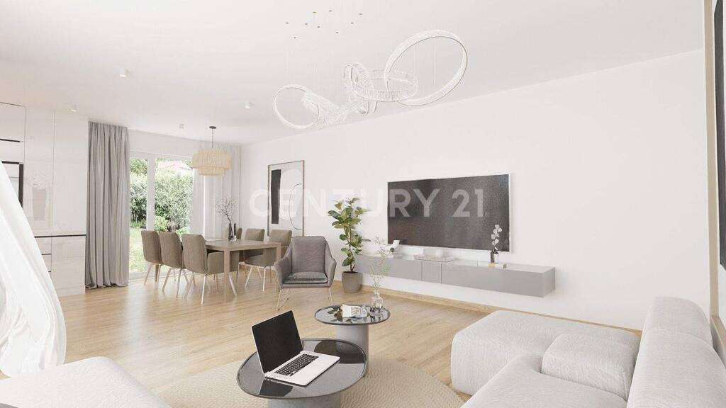 Das Herzstück der Wohnung bildet der offene Wohn-, Ess- und Kochbereich, perfekt für gemeinsame Stunden und geselliges Beisammensein. Große Fenster lassen viel Tageslicht herein und schaffen ein einladendes Ambiente. Vom Wohnbereich gelangen Sie direkt auf die private Terrasse, die zusätzlichen Freiraum zum Entspannen bietet.