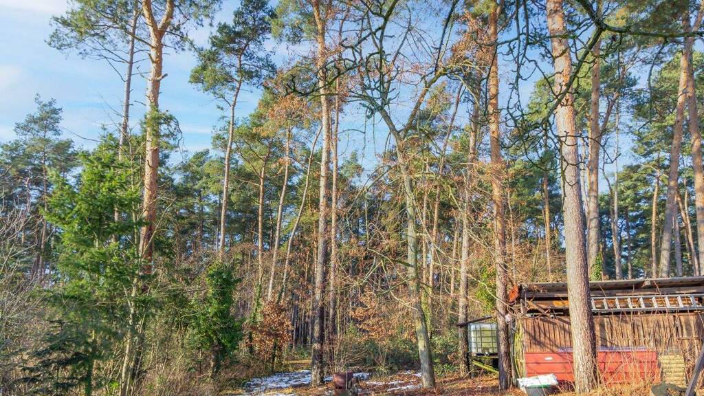 Garten: Der Garten ist eingezäunt und mit verschiedenen Bäumen und Gehölzen bewachsen. Als weitere Bebauung befindet sich auf dem Grundstück ein massives Nebengebäude das genügend Stauraum für Hobbywerkstatt, Fahrräder und Gartengeräte bietet. Weiterhin wurde im Nebengebäude ein Raum als Jägerstube ausgebaut. Auf dem Hof wurde eine Überdachung als Carport errichtet. Aus dem hinteren Grundstücksteil befindet sich eine große überdachte Remise als Abstellfläche für die Gartengeräte. Ein Ausgang führt an der hinteren Grundstücksgrenze direkt in den Wald.