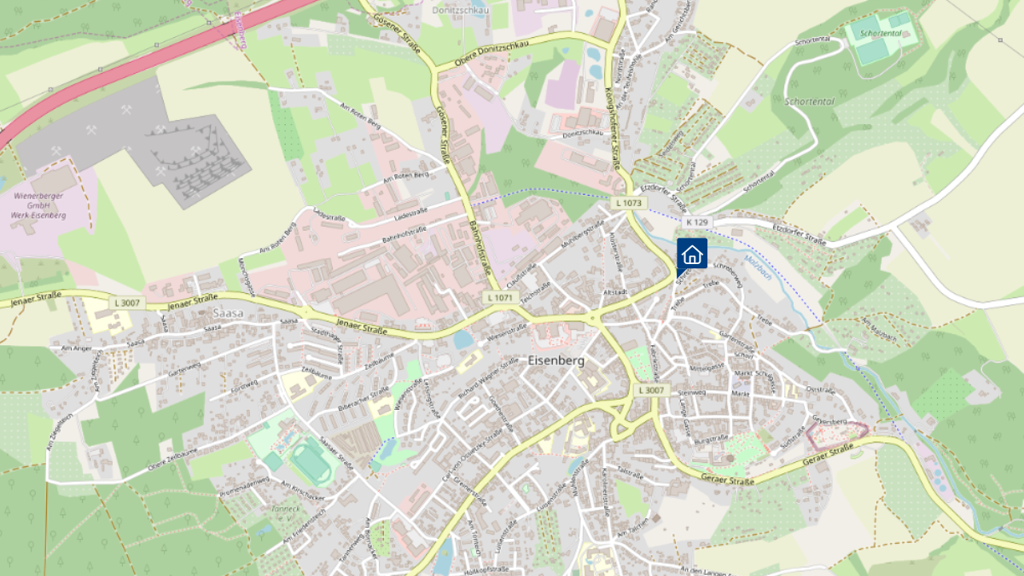 Eisenberg liegt im Osten Thüringens, im Saale-Holzland-Kreis, eingebettet in eine sanft hügelige, waldreiche Landschaft. Die Stadt befindet sich zwischen dem Thüringer Holzland und dem Elstertal und profitiert sowohl von ihrer naturnahen Umgebung als auch von ihrer ausgezeichneten verkehrlichen Anbindung: Die A?9 (Berlin-München) verläuft direkt westlich der Stadt und kann in unter 5 Minuten über kurze Zubringer erreicht werden. Dadurch ist Eisenberg bestens an größere Städte wie Jena (ca. 25?km westlich), Gera (ca. 20?km östlich) und sogar Leipzig (ca. 50?km nördlich) angebunden - ideal für Pendler. Die B7 verbindet die Stadt zudem direkt mit dem Hermsdorfer Kreuz und der A?4, womit auch Erfurt, Dresden und überregionale Ziele schnell erreichbar sind