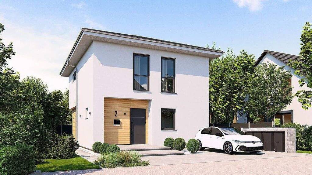 Schlichte Eleganz und ein durchdachtes Raumkonzept verleihen diesem Einfamilienhaus seine besondere Ausstrahlung. Die klare Linienführung der Architektur wird von einer zweifarbigen Fassadengestaltung betont, die Tiefe und Charakter schenkt. Im Inneren setzt sich diese Klarheit fort: Das Erdgeschoss öffnet sich zu einem lichtdurchfluteten Wohn-, Ess- und Kochbereich, der fließend in den Garten übergeht - ein Ort für lebendige Begegnungen und stille Augenblicke. Hauswirtschaftsraum und Gäste-WC sind dezent abgetrennt und sorgen für praktische Funktionalität. Von der großzügigen Diele führt eine Treppe ins Dachgeschoss, wo der Raum optimal genutzt ist: Ein helles Kinderzimmer, ein Elternschlafzimmer, ein Büro und ein komfortables Bad mit Wanne, Dusche und WC schaffen ein harmonisches Wohnumfeld. Auf rund 130 m² entsteht so ein Zuhause, das beständig Freude schenkt und Generationen verbindet.