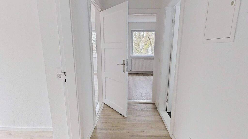 Alle Räumen werden von einem geräumigen Flur aus erreicht. Mittelpunkt der Wohnung ist das Wohn- und Esszimmer. Zwei große Fenster bringen viel Tageslicht in den Raum hinein und macht ihn hell und freundlich.