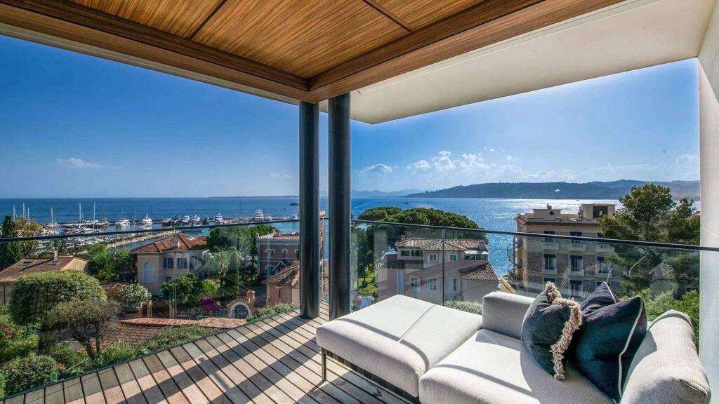 The top-floor apartment spans 110m2 and features three bedrooms, two bathrooms, a guest WC, an open-plan kitchen, a dining area, and a living room, all offering panoramic views of Cap d'Antibes, Juan-les-Pins Bay, and the Lerins Islands.