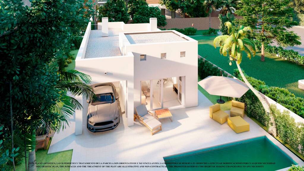 Die Villa befindet sich auf einer Ebene und besteht aus einem geräumigen offenen Wohn- und Essbereich mit großen Terrassentüren, die Zugang zur Terrasse und zum Garten bieten, einer modernen Küche im amerikanischen Stil, einem Hauptschlafzimmer mit eigenem Bad, zwei weiteren Doppelschlafzimmern und einem Gästebad. Über eine Außentreppe an der Rückseite des Hauses gelangt man auf die 75 m2 große Dachterrasse, auf der man den ganzen Tag über die Sonne genießen kann. Auch im Erdgeschoss gibt es viel Außenraum mit einer großen Terrasse und einem Gartenbereich mit der Möglichkeit, einen privaten Swimmingpool (verschiedene Größen zur Auswahl) hinzuzufügen. Die Häuser verfügen über eine vorinstallierte Klimaanlage, Einbauschränke in allen Schlafzimmern, LED-Beleuchtung, die Möglichkeit, in den Badezimmern eine Badewanne oder eine Dusche zu wählen, und zum Grundstück gehört auch ein überdachter Privatparkplatz.