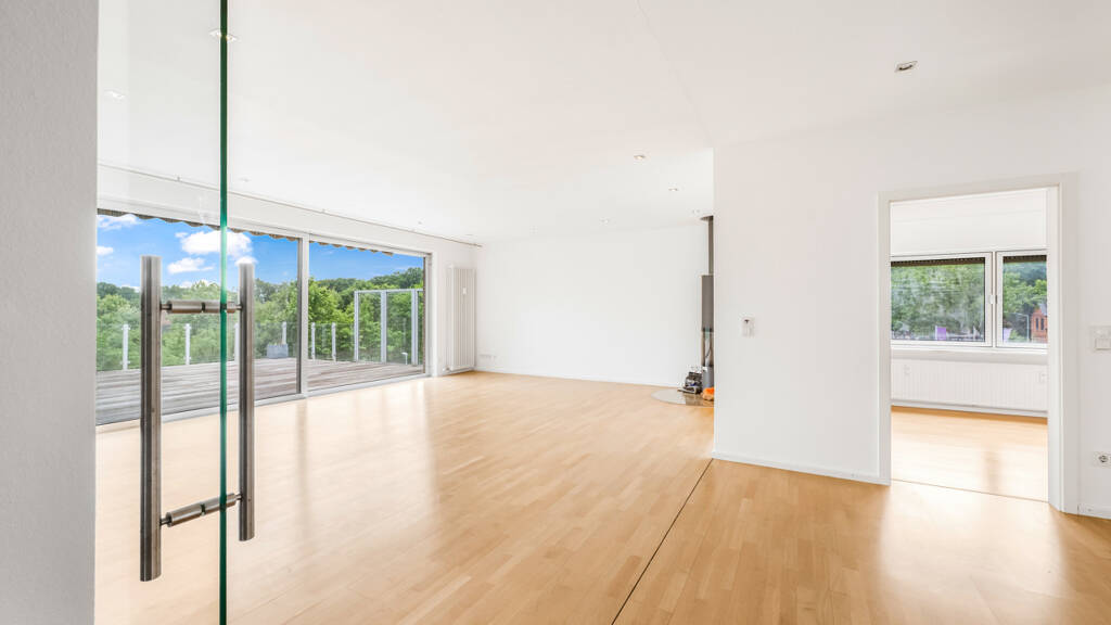Aktuell werden zwei Wohnungen sowie die Garagen vermietet, die dritte Wohneinheit im 1. Obergeschoss befindet sich in Sanierung. Die großzügige Einheit im 2. Obergeschoss überzeugt mit offener Raumstruktur, hochwertiger Ausstattung, Kamin, großem Bad sowie einer beeindruckenden Dachterrasse mit Weitblick ins Grüne. Die Gewerbefläche ist an ein Fitnessstudio vermietet und bietet durch ihre 24/7-Nutzung eine nachhaltige Einnahmequelle.