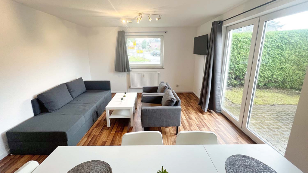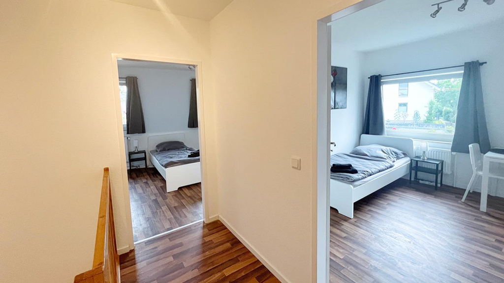 Im Erdgeschoss der Wohnung befinden sich die Küche, das Vollbad, ein Schlaf- oder Arbeitszimmer sowie das Wohnzimmer mit separatem Zugang zur Terrasse. Im 1. OG befinden sich neben einem Abstellraum noch drei weitere Schlafzimmer. Die ca. 140 m² große Wohnung ist sowohl für Familien als auch für die Vermietung ideal geeignet.