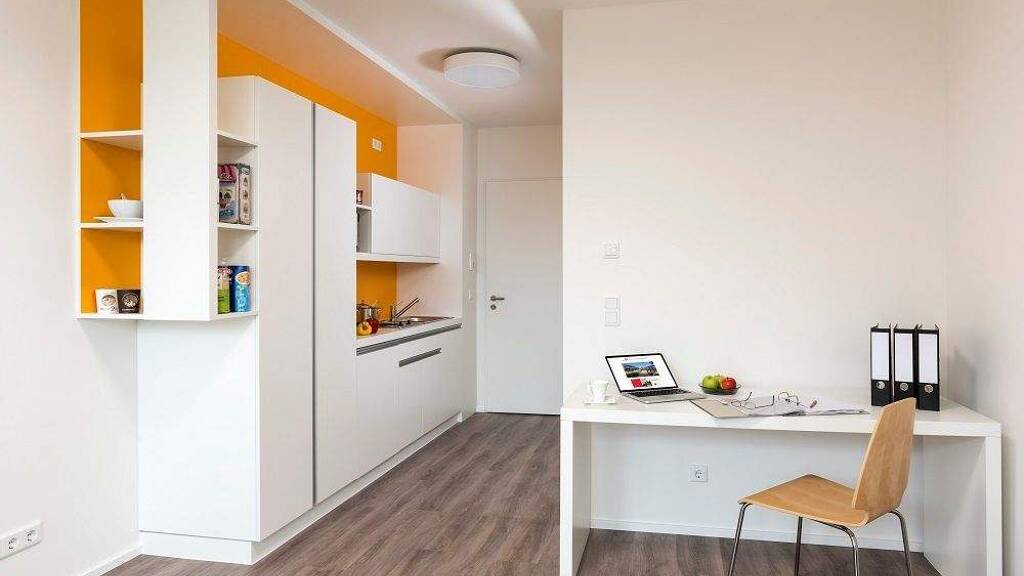 - Wohn-/Schlafraum mit Kleiderschrank und Schreibtisch ( Bett muss selbst mitgebracht werden)