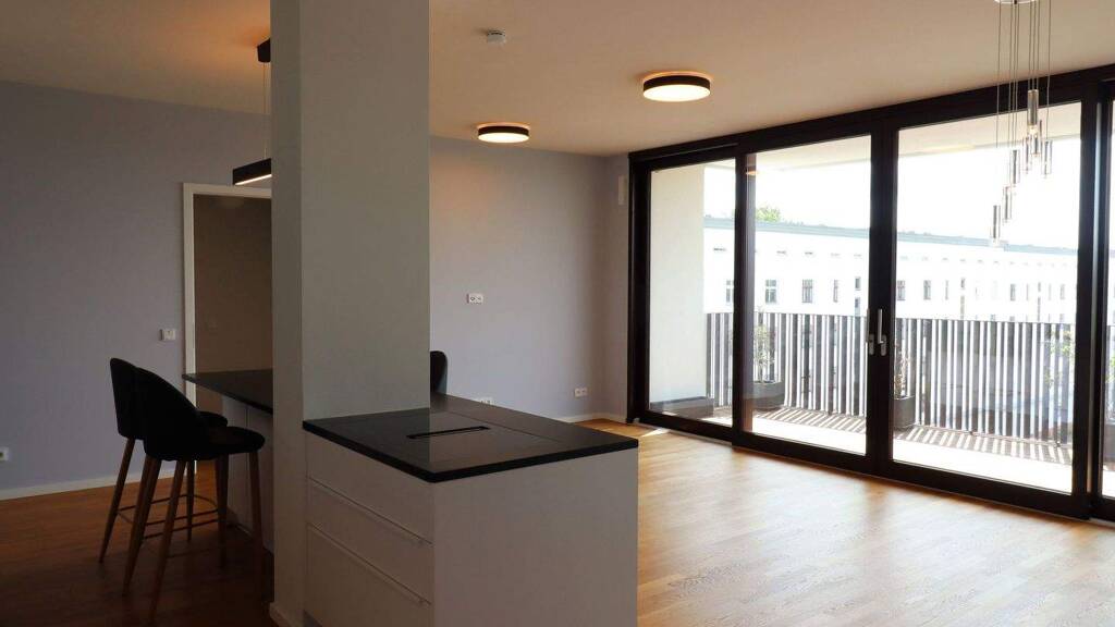 Die Böden im Wohnbereich sind mit Mehrschichtparkett gestaltet, eine moderne Einbauküche mit Kochinsel ist ebenso vorhanden. Die aufwendige technische Ausstattung zeichnet sich z.B. aus durch einen Glasfaseranschluss mit bis zu 1.000 Mbit/s, viele LAN-Anschlüsse, eine Video-Gegensprechanlage, sowie einen gehobenen Einbruchschutz. Von der Tiefgarage ist die Wohnung mit dem Aufzug stufenlos zu erreichen.