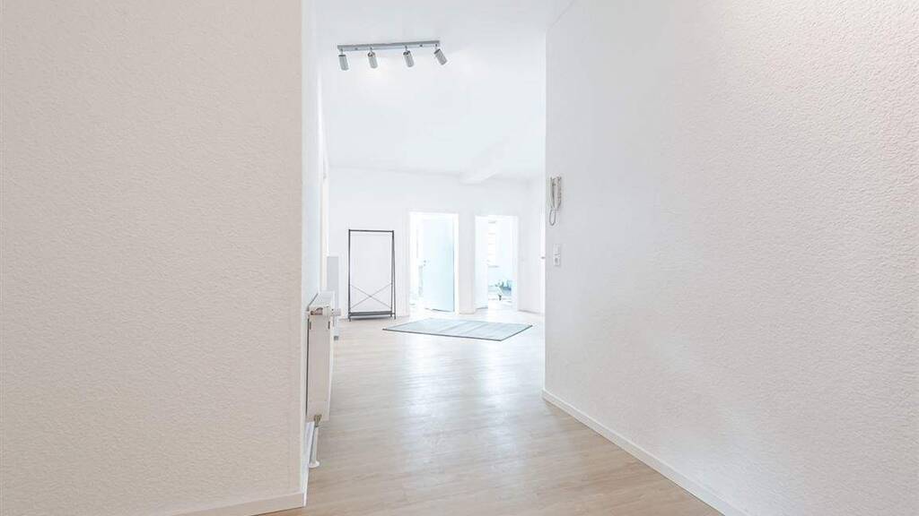 Bereits beim Betreten der Wohnung empfängt Sie ein weitläufiger und repräsentativer Eingangs- und Flurbereich, der eine klare und durchdachte Raumaufteilung offenbart. Von hier aus gelangt man direkt in den großzügig und offen gestalteten Wohn- und Essbereich, der dank großer Fensterflächen lichtdurchflutet ist und als zentraler Mittelpunkt der Wohnung eine einladende Wohnatmosphäre schafft.