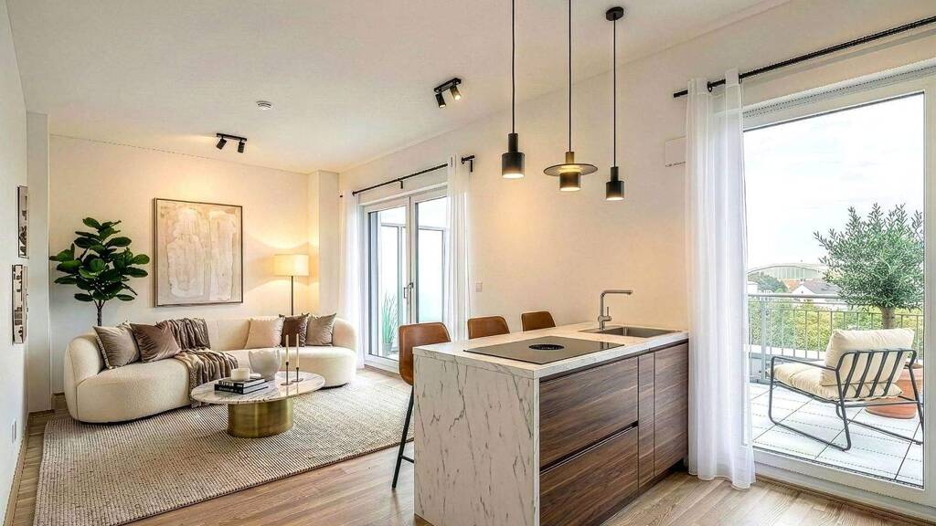 Der Wohnbereich mit offener Küche erstreckt sich über ca. 24 m² und bietet Raum für gemeinsame Momente. Neben dem Hauptschlafzimmer, das ca. 16 m² misst, befindet sich ein weiteres Zimmer, das mit etwa 13 m² perfekt als Kinder-, Hobby- oder Arbeitszimmer geeignet ist. Darüber hinaus verfügt die Wohnung über ein Gäste-WC und Badezimmer, ausgestattet mit einem Oberlichtfenster, welches für ein angenehmes, natürliches Licht sorgt, sowie einer Dusche und Badewanne. Die bodentiefen Fenster sind 3-Fach isoliert und sorgen für viel Tagslicht in allen Zimmern. Moderne Schalterdesigns und eine Video-Gegensprechanlage verleihen der Wohnung zusätzliche Eleganz und auch ein Kellerabteil ist der Einheit zugeordnet. Die Tiefgaragenstellplätze, welche über E-Ladestationen verfügen, runden dieses exklusive Angebot ab.