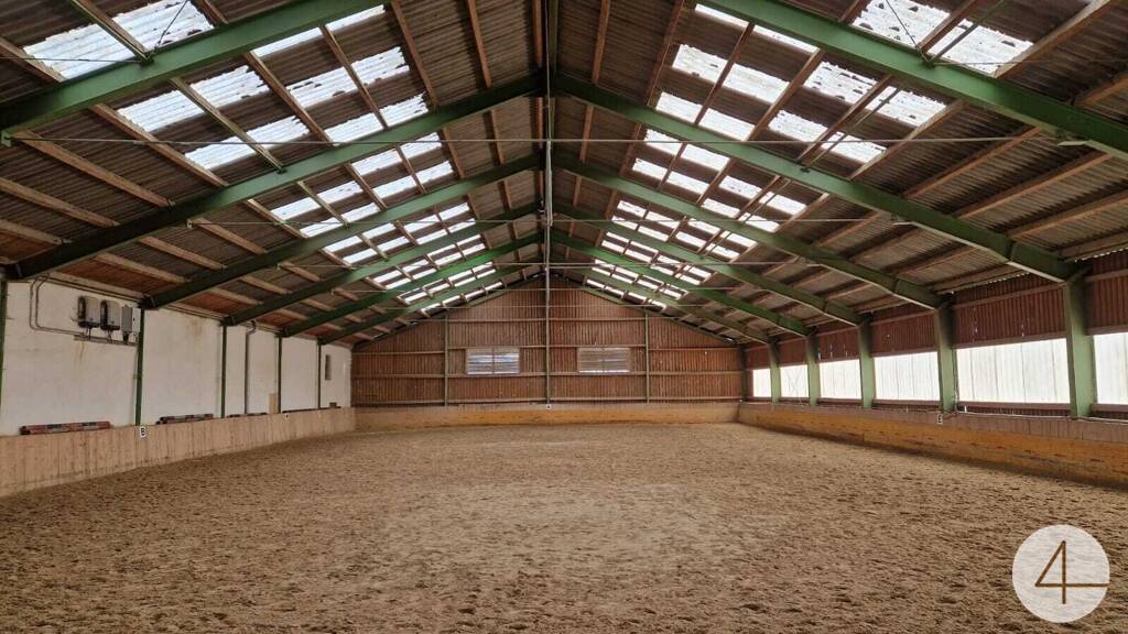 In einem anschließenden Gebäude befindet sich zur Zeit ein Pferdestall (Fotos). Im Außenbereich gibt es noch eine große Reithalle, sowie einen Geräteschuppen etc. Nicht weit vom Stall entfernt sind einige Koppeln und ein großer Reitplatz.