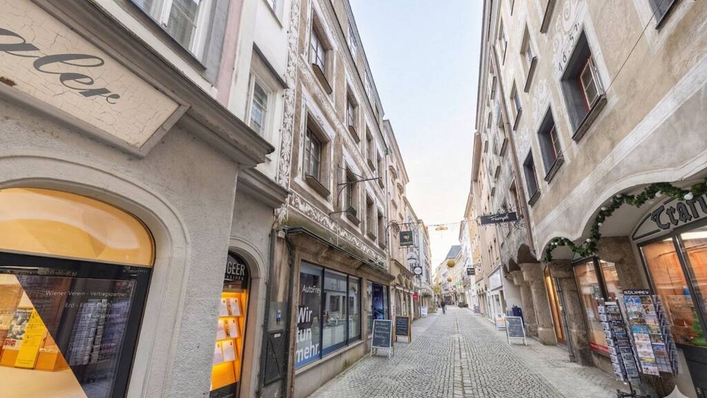 Dieses außergewöhnliche Zinshaus befindet sich in bester Innenstadtlage von Steyr, nur wenige Schritte vom historischen Hauptplatz entfernt. Die Enge Gasse ist Teil der charmanten Fußgängerzone und zählt zu den begehrtesten Lagen der Steyrer Altstadt.