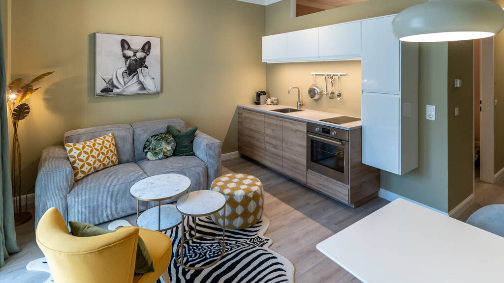 Pusteblumen in Überlebensgröße und die geräumige Regendusche machen das Bad unseres "Green Velvet" 2-Zimmer Apartments auf jeden Fall zu etwas Einzigartigem. Das Apartment bietet einen gemütlichen Wohnraum mit Zugang zum kleinen Garten und ein separates, kuscheliges Schlafzimmer mit großem Boxspringbett. Der Backofen ermöglicht auch aufwändigeres Kochen in der komplett ausgestatteten Küchenzeile.