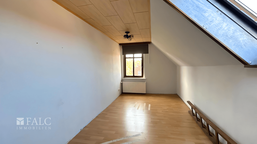 Im Obergeschoss befinden sich ein großes Schlafzimmer sowie ein weiteres Zimmer, das sich flexibel als Kinder-, Arbeits- oder Gästezimmer nutzen lässt. Besonders hervorzuheben ist das helle, großzügig geschnittene Badezimmer mit Tageslicht, Dusche und Badewanne. Eine Treppe führt weiter ins Dachgeschoss, wo zwei weitere Zimmer sowie eine praktische Abstellkammer zusätzlichen Raum bieten.