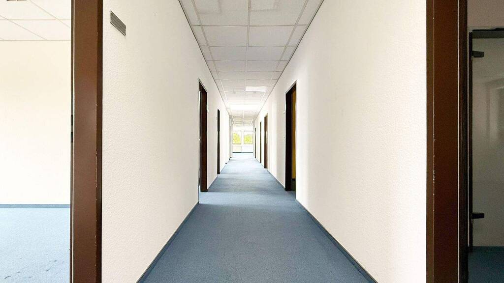 Das erste Obergeschoss bietet auf einer Fläche von ca. 368 m² eine moderne und gepflegte Umgebung, die derzeit ungenutzt ist. Die Etage umfasst zahlreiche Büroeinheiten unterschiedlicher Größen, die je nach Bedarf flexibel angepasst oder zu größeren Einheiten zusammengelegt werden können. Besondere Aufmerksamkeit verdient die Küche, welche mit einer zeitgemäßen Einbauküche ausgestattet ist, die als Aufenthaltsbereich für Mitarbeiter dient, sowie getrennte WC-Anlagen. Ein zentraler Flurbereich verbindet die einzelnen Räumlichkeiten miteinander und trägt durch die großflächigen Fensterfronten zu einer lichtdurchfluteten und angenehmen Arbeitsumgebung bei.