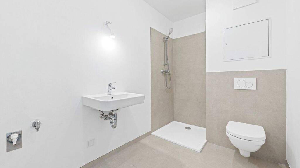 Neben dem Eingangsbereich liegt das moderne Badezimmer mit fast 5 m² Größe, welches mit einer Duschkabine, einem Handwaschbecken, einer Toilette und einem Waschmaschinen-Anschluss ausgestattet ist.