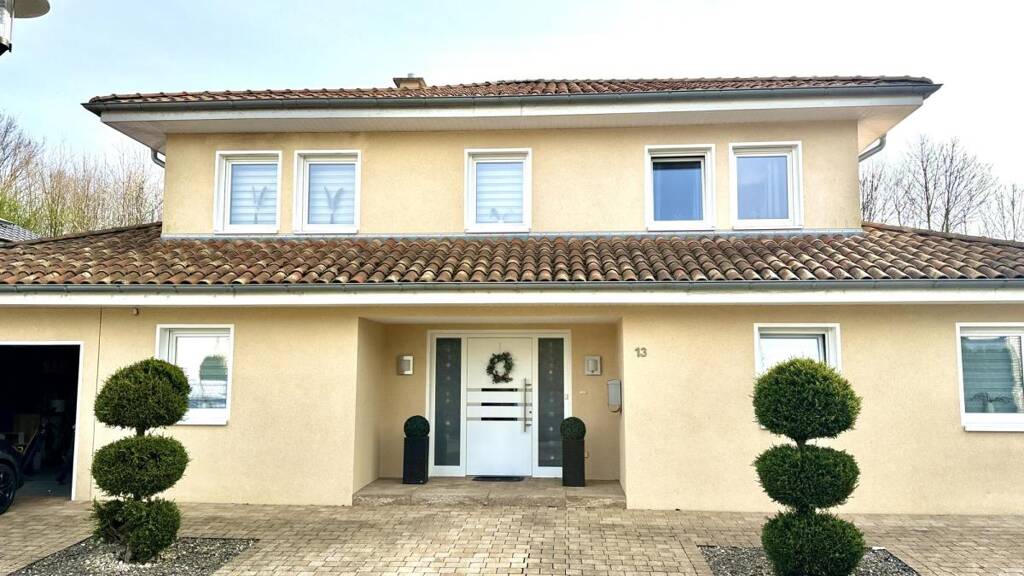 Ausstattung . Baujahr Gebäude: 2008 . massive Bauweise . Wohnfläche: ca. 154,55 m² . Grundstück: ca. 511 m² . 5 Zimmer . 1 Badezimmer . Luft-Wärmepumpe (Baujahr 2008) . Kaminofen mit wasserführendem Wärmetauscher . Photovoltaikanlage ca. 10 kWp (ca. 3 Jahre alt) . Batteriespeicher ca. 10 kWh . Solarthermieanlage . Energiekennwert: ca. 20,08 kWh/(m²·a) . dreifach verglaste Fenster . elektrische Rollläden . Glasfaseranschluss . überdachte Terrasse . Sonnenterrasse mit Bangkirai-Holz . Gartenhaus . 54 m tiefer Gartenbrunnen . Garage mit direktem Zugang zum Haus . Gäste-WC in der Garage . Wallbox / Ladeanschluss für Elektrofahrzeuge . großzügiger Hauswirtschaftsraum . separates Büro im Erdgeschoss