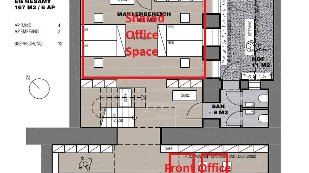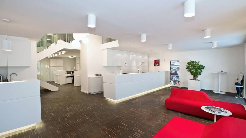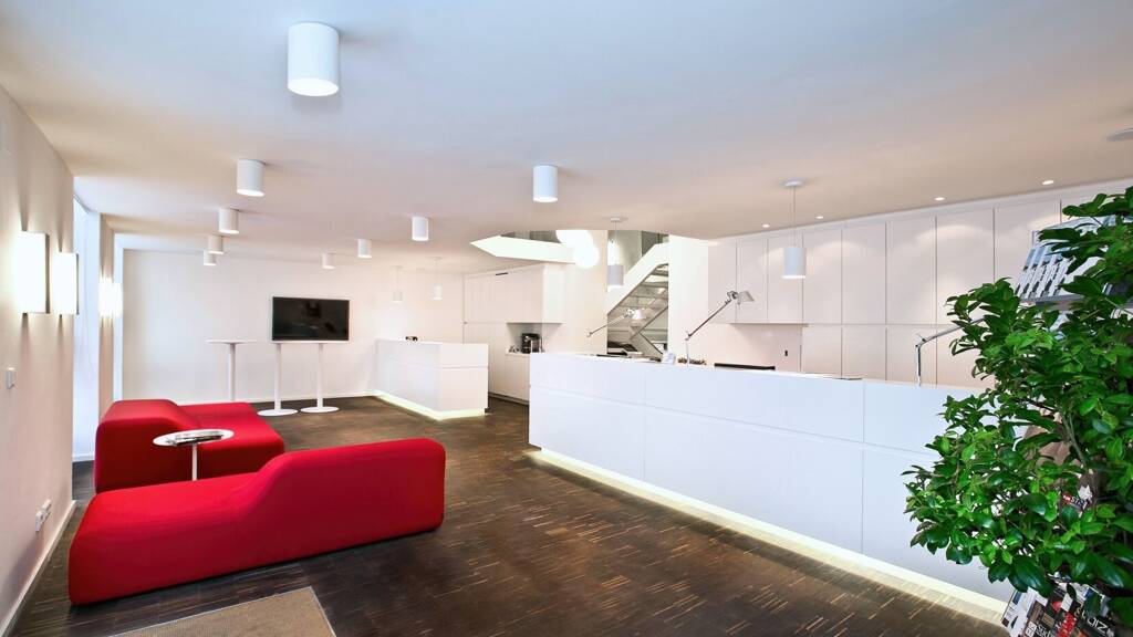 Die ehemalige Bankfiliale verfügt nicht nur über große Auslagen, die das Tageslicht optimal einfangen, sondern auch über ein kleines Atrium, eine kleine Ruheoase. Der Zugang ist direkt von der Straße aus möglich. Das Büro wurde komplett saniert und mit viel Glas versehen, damit ein modernes, offenes Raumgefühl entsteht. Im hinteren Bereich gibt es eine vollausgestattete Küche mit Essplätzen, zusätzlich zur Kaffeebar im Empfangsbereich. Ein Besprechungsraum mit bis zu 12 Plätzen und Beamer kann nach Fair-Use-Prinzip genutzt werden.