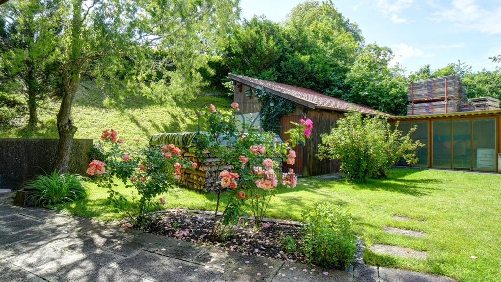 Auf der Südseite befindet sich ein geräumiger Schuppen in Hanglage. Daneben gibt es weitere Lagermöglichkeiten und einen Anbau mit überdachten Freisitz. Gartengeräte, Fahrräder sowie Außenmöbel lassen sich hier gut einlagern. Die Terrasse ist nach Süden ausgerichtet, vom Balkon zur Hälfte überdacht, und bietet bis in die Abendstunden Westsonne. Perfekt für gesellige Abende mit Familie und Freunden.