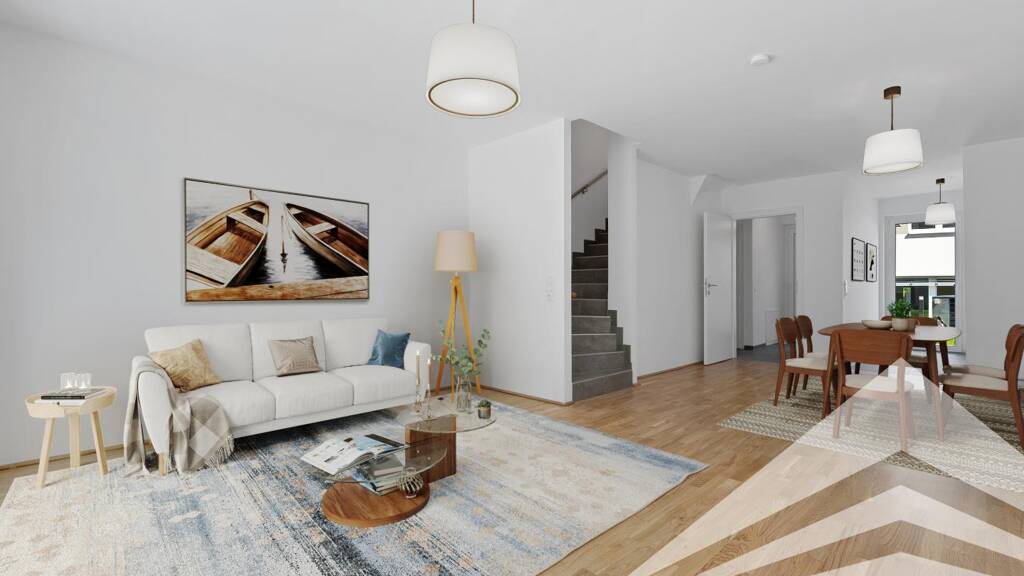 Für ein besseres räumliches Verständnis können einzelne Bilder digital möbliert worden sein und zeigen beispielhafte Einrichtungsvorschläge. Die abgebildeten Möbel sind nicht im Angebot enthalten.