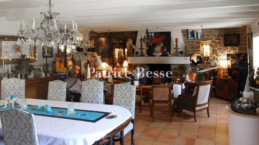 The property is nestled a few hundred metres from the local village in a bucolic backdrop. A solid grey gate of wrought iron leads into the grounds. It is framed between two granite pillars, one of which has an outdoor lamp fixed to it. On either side, a low wall and tall hedges give the property absolute privacy. The manor and its outhouses form a U shape. On the grounds, which cover almost one hectare, several spaces can be distinguished: there is an ornamental, tree-dotted garden embellished with flowers on the west side, a south-facing courtyard, and a car park on the east side. An annexe houses a covered swimming pool that looks out at the ornamental garden. And an events venue with a wooden floor adjoins an outhouse to form a large reception space. You enter the manor from a short driveway that leads from the wrought-iron gate. The edifice dates back to the 15th century, as a door surround upstairs and a spiral staircase indicate. The building has been redesigned several times over its long history. The year '1701' is inscribed in the entrance door's lintel. The dwelling is long and rectangular in shape. It has a ground floor, a first floor and a second floor in the roof space. A gable slate roof crowns the house. The facade is made of pink rubble granite. Ashlar forms the window and door surrounds. There are many small-paned windows. The entrance door stands in a recess, beneath a rectangular window. A dormer with a triangular pediment gives character to the edifice's west end. There is a secondary door beside a schist sundial that dates back to 1740. A cavity in the facade once formed an alcove for a dog. Opposite, there is a dome-covered well crowned with a granite cross. Pale gravel covers the courtyard. Wisteria grows up the facade.