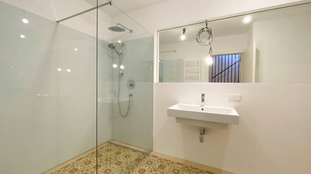 Vom Eingangsbereich führt der Flur direkt in das neu gestaltete Badezimmer mit moderner Dusche - ein harmonischer Mix aus authentischem Charme und zeitgemäßem Komfort. Auf derselben Ebene befindet sich der großzügige Schlaf- und Arbeitsbereich mit knapp 26 m², der durch sein offenes Design vielseitige Gestaltungsmöglichkeiten bietet.