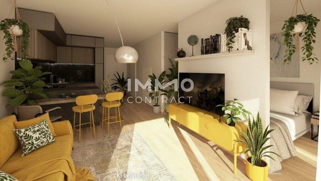 Raumaufteilung: Abstellraum, Bad/WC, Wohnküche (Küche nicht möbliert) mit abgetrennten Schlafbereich, Terrasse/Loggia. Jeder Wohnung ist ein eigenes Kellerabteil zugeordnet.