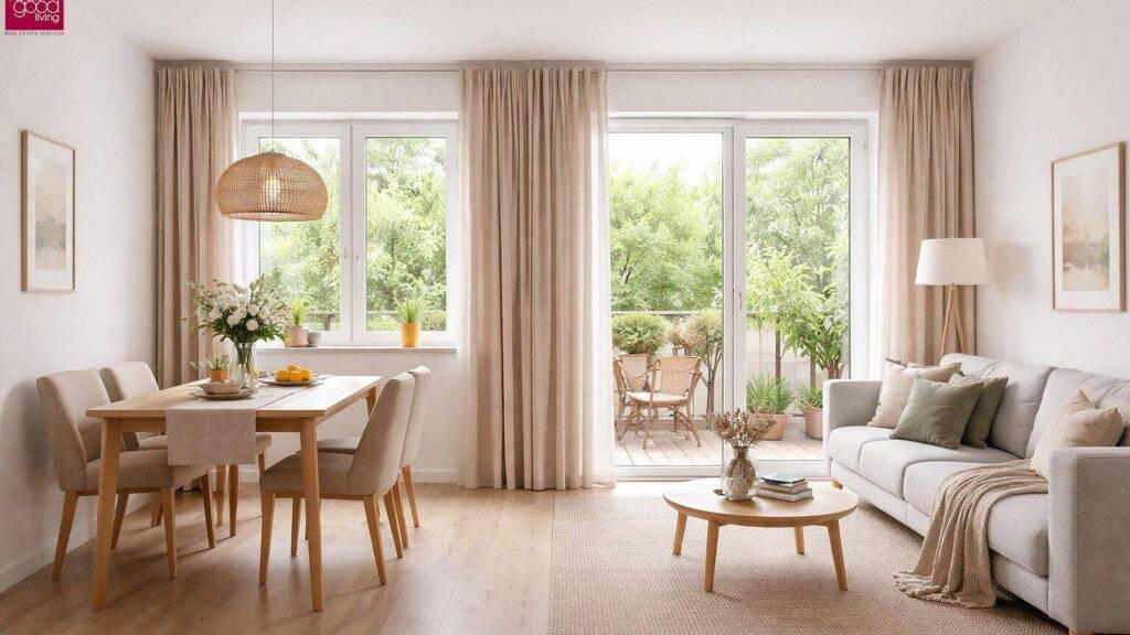 Der offen gestaltete Wohn- und Essbereich bildet das HerzstĂĽck der Wohnung und bietet direkten Zugang zum Balkon - ideal fĂĽr entspannte Stunden im Freien.