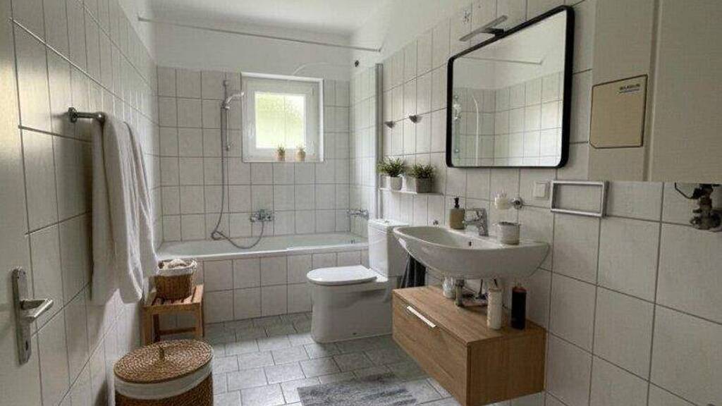 * gepflegtes Badezimmer mit Badewanne, Fenster und Waschmaschinenanschluss