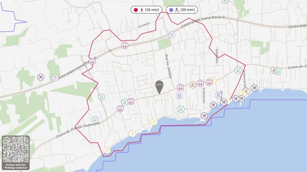In der näheren Umgebung sind alle Geschäfte für den täglichen Bedarf vorhanden. Darüber hinaus gelangen Sie in wenigen Minuten zu diversen traumhaft schönen Stränden. Der internationale Flughafen in Split liegt ca. 15 Fahrminuten entfernt. Von Split ist außerdem die beliebte Insel Brac in kurzer Zeit zur erreichen.
