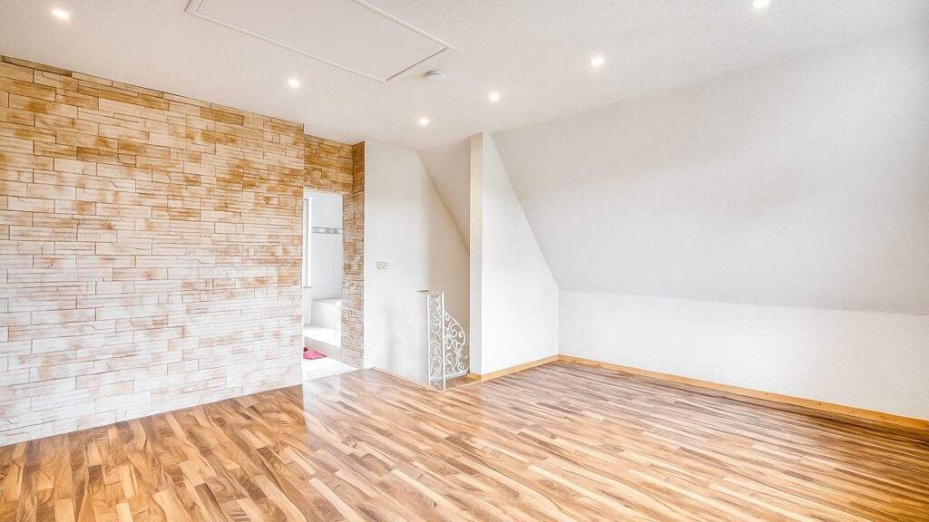 Das Obergeschoss beherbergt das großzügige Schlafzimmer unter dem Dach, das durch seine durchdachte Raumaufteilung und die maßgefertigte Schrankwand besonders viel Stauraum bietet. Das angrenzende Tageslichtbad im mediterranen Stil vermittelt mit warmen Farben und hochwertigen Fliesen echtes Urlaubsgefühl - eine kleine Wellnessoase im eigenen Zuhause.