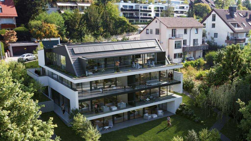 •Solarthermie auf dem Dach für die Herstellung des Brauchwassers Photovoltaik-Paneele zur nachhaltigen Stromerzeugung inkl. Speicher kontrollierte, dezentrale Wohnraumlüftung