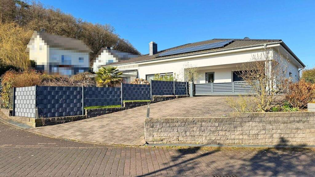 Das hier zum Verkauf angebotene Einfamilienhaus in Bungalowbauweise aus dem Jahr 2015 mit ca. 169 m² Wohnfläche wurde auf einem 1.397 m² großen Grundstück in massiver Bauweise errichtet und befindet sich in der schönen Gemeinde Trassem. Das Grundstück teilt sich in zwei Parzellen auf: 778 m², auf denen das Wohnhaus steht, und weitere 619 m² als weiteres Bauland, welches derzeit als Garten genutzt wird.