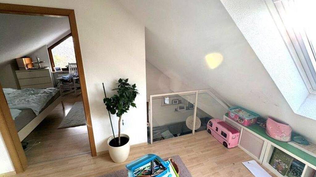 4 Zimmer Maisonettewohnung in einem 6-Familienwohnhaus mit Hausmeisterservice. Über den Eingangsbereich gelangt man in den offenen Wohn/Eß/Kochbereich. Vom Wohnzimmer kommt man auf den nach Süden ausgerichteten Balkon. Hier kann man den Sonne genießen. Die kleine, gemütliche Küche ist offen gehalten. Im unteren Bereich der Wohnung befinden sich 2 geräumige Schlafzimmer. Das großzügige Badezimmer mit Badewanne, Dusche und Toilette. Im oberen Teil der Wohnung befindet sich ein weiteres Schlafzimmer. Ein zur Wohnung gehörender Kellerraum befindet sich im UG. Ebenfalls ist dort der Wasch/Trockenraum. Eine Garage ist Bestandteil der Immobilie.