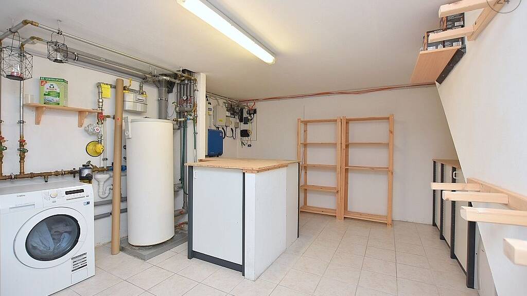 - Waschküche/Kellerraum mit Waschtrockner, großem Gefrierschrank, Regalen und Schränken