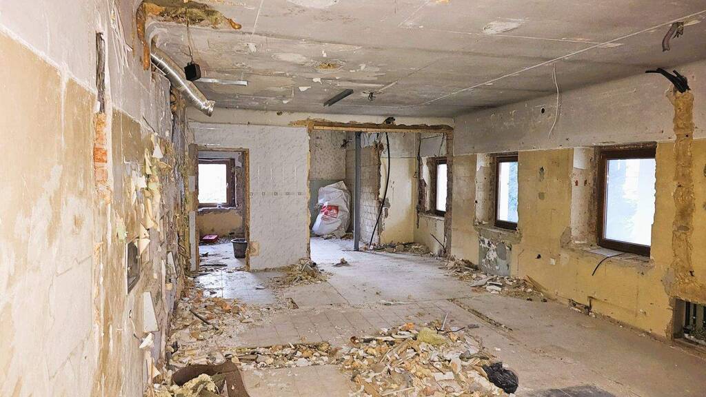 Großzügiges Foyer mit Zugang zur ehemaligen Kasse und dem Zwischenflur. Gästetoiletten, Küchenraum und großer entkernter Zuschauerraum. Treppe zum ehemaligen Vorführerraum und zwei ehemaligen Wohnungen,