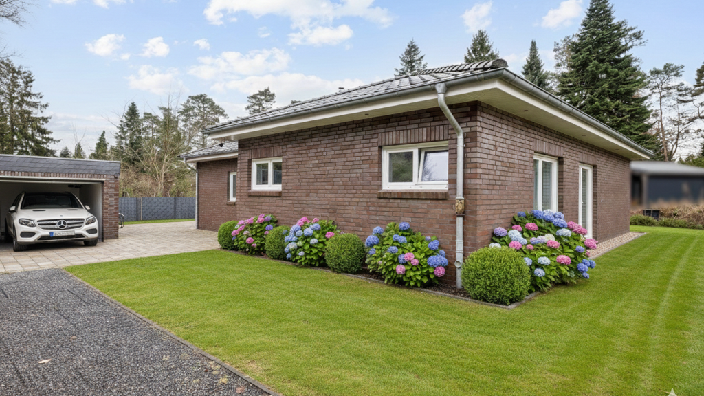 Abgerundet wird das Gesamtbild durch eine praktische Doppelgarage, die zusätzlichen Stauraum bietet und Ihre Fahrzeuge zuverlässig schützt. Dieser Bungalow ist ein Ort, an dem man sich sofort wohlfühlt und an dem viele schöne Erinnerungen entstehen können.