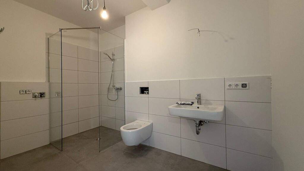 Das Badezimmer ist modern gestaltet und verfügt über eine Glasdusche sowie einen Waschmaschinenanschluss. Objektbeschreibung - Vinylboden in allen Wohnräumen