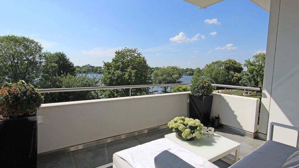 Die im ersten Obergeschoss gelegene lichtdurchflutete Wohnung ist in einem außerordentlich gepflegten Mehrfamilienhaus mit einer weißen sehr ansprechenden modernen Putzfassade gelegen. Das Highlight der Wohnung ist der direkte Alsterblick aus jedem Zimmer! Der repräsentative mit dunkelgrauen Granitfußboden verlegte Eingangsbereich setzt sich in der Wohnung fort. So sind der Flur, das Bad, die Gästetoilette und Küche ebenfalls mit den großen Granitplatten ausgestattet und harmoniert ideal mit dem eleganten Eichen-Parkettfußboden, welcher in der luxuriösen Wohnung verlegt wurde. Die Wände und Decken werden komplett weiss und neu gestrichen übergeben. Das elegante Bad mit Dusche und Badewanne, sowie das Gäste WC mit Stellfläche für die Waschmaschine und Trockner und die hochwertige Poggenpohl-Einbauküche mit Siemens-Elektrogeräten werden komplett überarbeitet. Zur Küche gehören ein Herd mit Backofen, Kühlschrank und Tiefkühlschrank, Spüle, Geschirrspülmaschine, Ober- und Unterschränke, sowie ein Apothekerschrank. Das architektonisch raffiniert geschnittene Wohnzimmer geniesst bodentiefe Fenster und einen einzigartigen Panoramablick auf die Außenalster. Von hier aus gelangt man auch auf die Südwestterrasse mit Blick in den schön angelegten Garten und auf die Alster. Das Schlafzimmer bietet einen praktischen begehbaren Kleiderschrank und weitere eingebaute Kleiderschränke. Es besteht die Möglichkeit eine Alarmanlage zu installieren. Glatt verputzte Wände, Fenster mit A3-Verglasung (Einbruchschutz) und Weißglasscheiben, sowie Fußbodenerwärmung im Bad unterstreichen das exklusive Flair der Wohnung. Ein Kellerraum ist der Wohnung zugeordnet.
