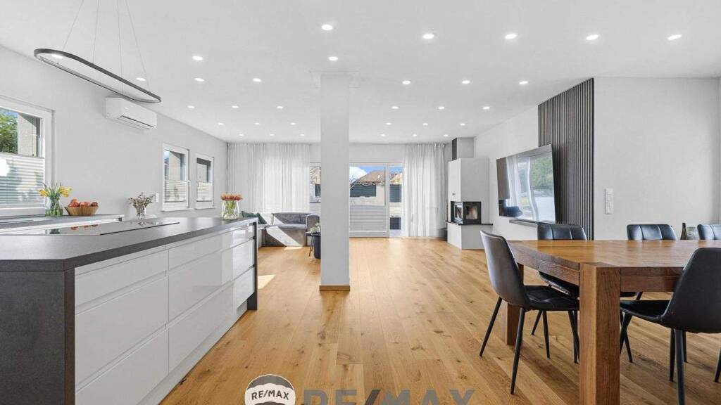 Das Herzstück des Hauses bildet das großzügige, zentral gelegene Wohnzimmer mit integrierter Küche und einer Fläche von rund 62 m². Der offene Wohn- und Essbereich schafft eine helle und einladende Atmosphäre und bietet direkten Ausgang auf die Terrasse sowie zur überdachten Outdoor-Küche - ideal für gesellige Abende und entspanntes Wohnen im Freien. Zusätzlich befinden sich im Erdgeschoss ein weiterer Schrankraum sowie ein modernes Gäste-Bad mit WC.