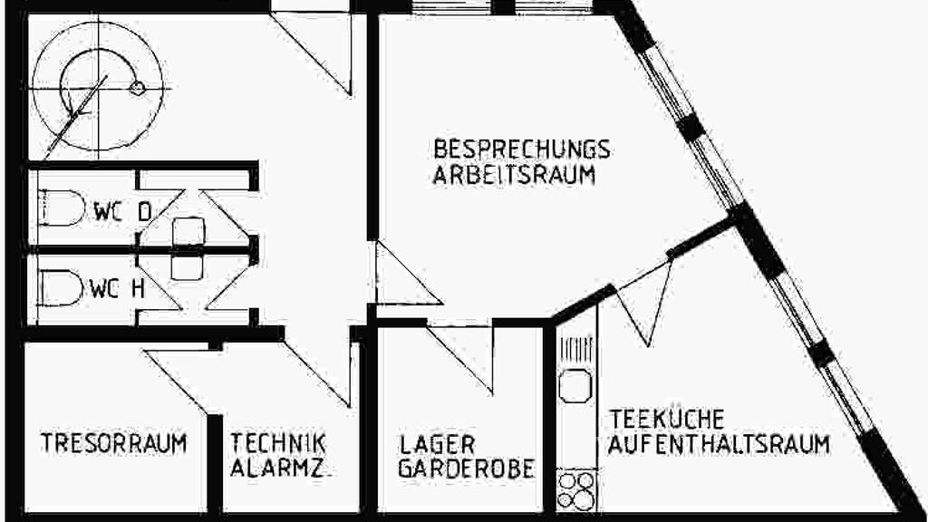 - barrierefreier Zugang - Foyer - Fußboden im EG: Naturstein Granit, Teppich von 2014 (variabel) - Fußboden im UG: PVC, Fliesen - 3 x Split-Klimaanlagen - getrennte Toiletten - Personalraum mit Kücheneinrichtung - Tagestresore nach VDS Richtlinien, UVV-Kassen - zentrale Musikanlage - großer Tresor der Bank kann übernommen werden - Raster- / Akustikdecken mit Deckenbeleuchtung - zentrale EDV-Verkabelung bereits mit CAT-7 für 15 Computer - erweiterbar, Kabelkanäle - IP-Telefonanlage - Beheizung durch eine Gaszentralheizung - PKW-Stellplätze bzw. Tiefgarage vorhanden - frequenzstarke Nachbarmieter (NKD, Outdoorbekleidung) - Wendeltreppe ins UG mit 5 Räumen und Tresor - Umbau möglich - Kaltmietpreis VHB