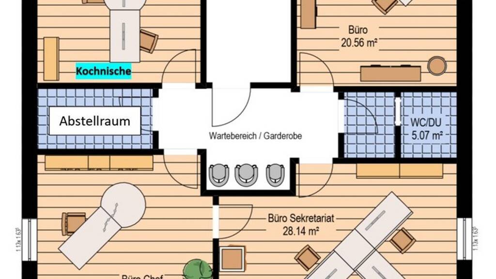 Büroraum 1 = ca. 20,56 qm Büroraum Sekretariat = ca. 28,14 qm Büroraum Chef = ca. 23,16 qm Büroraum Besprechung = ca. 20,59 qm inklusive Teeküche Abstellraum = ca. 5,10 qm Flur / Wartebereich = ca. 13,04 qm WC mit Dusche = ca. 5,08 qm Elektrische Rollo Netzwerkverkabelung Als Bodenbelag befinden sich in den Büroräumen ein hochwertiger Nadelfilz. Flur und WC sind gefliest.