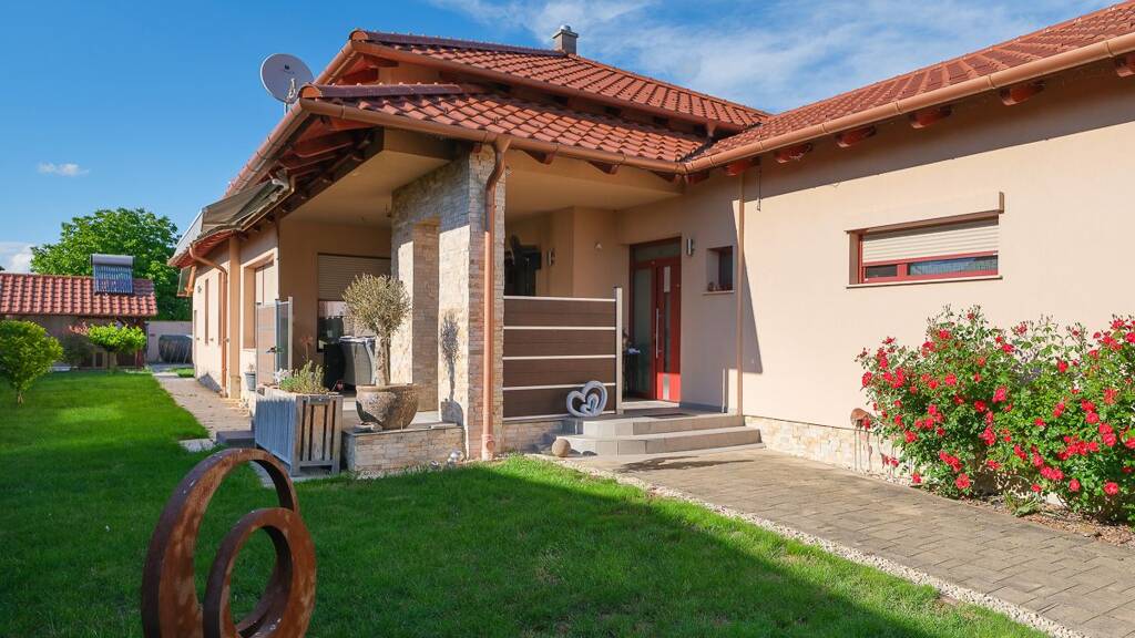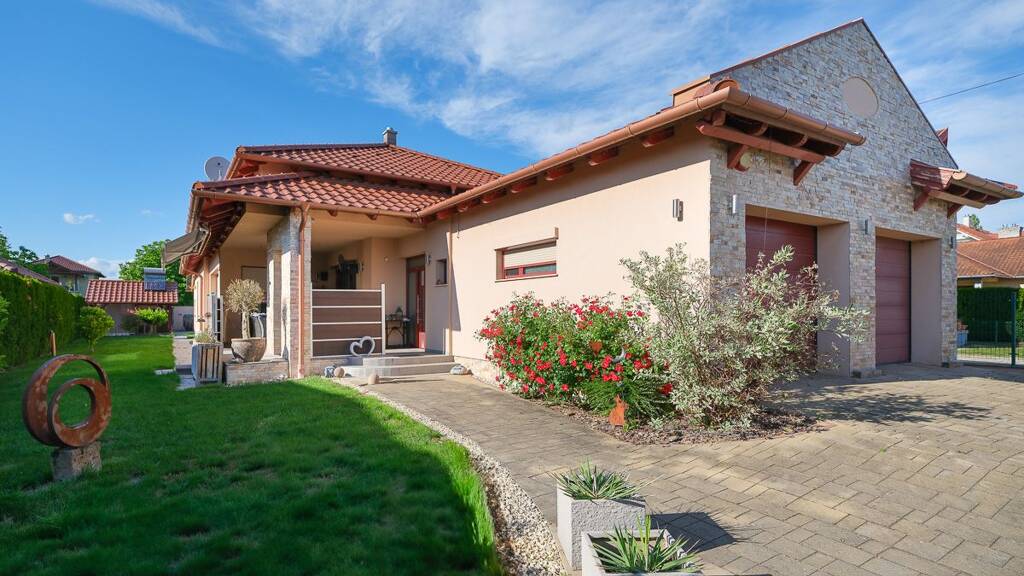 Exklusives Einfamilienhaus in mediterranischer Stil im frekventiertem Stadtteil von Keszthely ist zu verkaufen. Das äußere Erscheinungsbild des Hauses, die Gestaltung und Ausführung vom Interieur sind alle hochqualitativ. Das Haus wurde im Jahre 2016 gebaut, mit in der Zeit verfügbaren höchstqualitativen Baumaterialien und mit einer Ausfrührung auf sehr gutem Niveau. Die Innenräume und die Umgebung des Hauses sind sehr liebevoll gepflegt. Das Grundstück ist umgezäunt, auf der Strassenfront ist ein schönes, maßgefertigtes Schmiedeeisen - Gartentor für Fußgänger und Fahrzeuge vorhanden. Das Grundstück kommt mit einer überdachten Grillküche und einem mobilen Pool. Der Garten ist schön gepflegt, kommt mit Rasen und Zierpflanzen. Die teschnische Ausstattung des Hauses ist von sehr hoher Qualität, es ist mit Smart Home System ausgestattet. Die Kühlung und Heizung des Hauses, und das Warmwasser wird mit einer Hochleistungs-Luft-Wärmepumpe erzeugt. Das energieeffiziente System funktioniert zuverlässig. Die Lage des Hauses innerhalb der Siedlung ist ausgezeichnet, es liegt in einer ruhigen, stillen Strasse. Vom Haus sind der Strand am Plattensee, Restaurants, Einkaufszentren leicht zu Fuß erreichbar. Dieses Anwesen ist eine ausgezeichnete Investition!