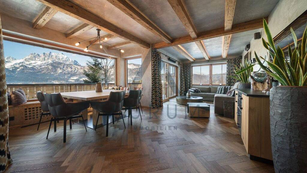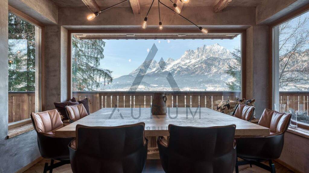 Ein besonderes Highlight ist der exklusive Wellnessbereich mit Sauna und Indoor-Pool, der zu jeder Jahreszeit private Entspannung auf höchstem Niveau bietet. Großzügige Fensterflächen eröffnen einen atemberaubendem Panoramablick auf den Wilden Kaiser und holen die alpine Natur direkt ins Haus.