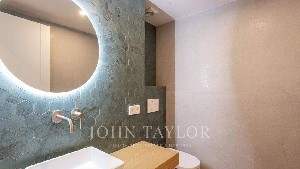 Angrenzend an die Küche befindet sich ein separater Waschraum mit zusätzlichem Stauraum. Die Suite des Eigentümers ist ein privater Rückzugsort mit einem großzügigen Schlafzimmer, einem eigenen Bad und zwei Ankleidebereichen. Die Wohnung verfügt außerdem über zwei weitere Schlafzimmer, ein Vollbad und ein Gäste-WC.