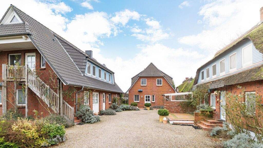 Das ehemalige Bauernhaus mit klassischem Reetdach und malerischem Blauregen besticht durch seinen unverwechselbaren Charakter. Im Erdgeschoss erwarten Sie zwei Wohn- oder Schlafräume mit Bad - eines davon mit Sauna - ein gemütlicher Wohnraum mit Ofen, eine einladende Diele, zwei Hauswirtschaftsräume sowie ein großzügiger, lichtdurchfluteter Wohn- und Essbereich mit Küche. Im Obergeschoss bieten drei weitere Wohn- oder Schlafräume, zwei Bäder, eine Küche und ein heller, offener Begegnungsraum das Herzstück des Hauses. So entsteht ein Wohnbereich, der Tradition, Komfort und Gemeinschaft auf harmonische Weise verbindet.