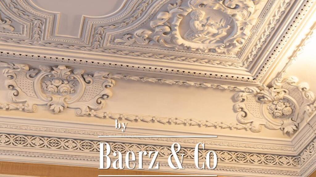 the majestic staircase leading to the ground floor is adorned with crafted walls and ceilings, and an impressive skylight window that creates a unique ambience.