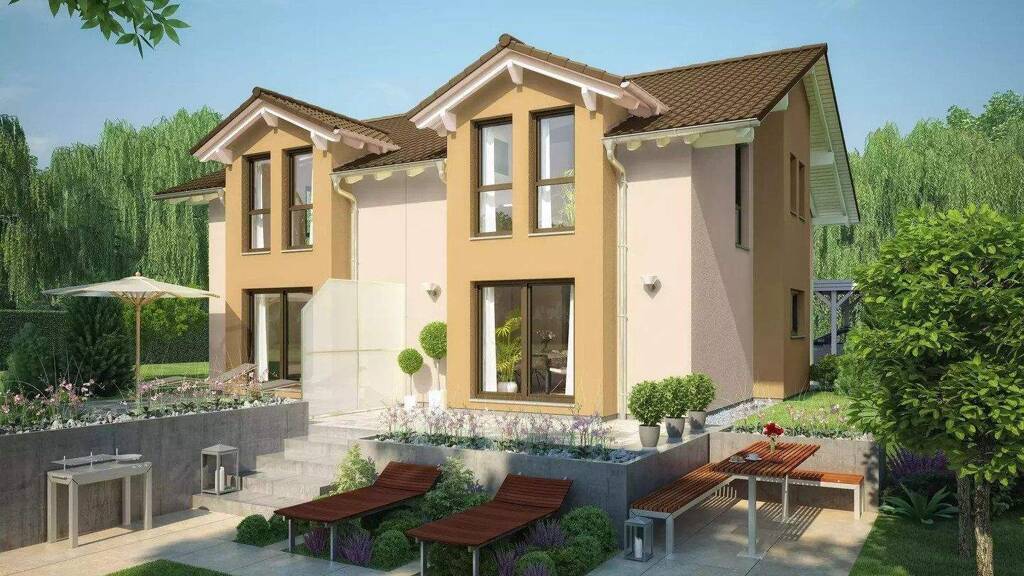 Wer Geselligkeit mag, für den ist ein Doppelhaus die perfekte Lösung: Man wohnt Tür an Tür mit Freunden, Geschwistern oder den Eltern und kann sich jederzeit zu einem Plausch treffen. Durch die beiden separaten Hauseingänge ist dennoch die Privatsphäre gesichert. Wie attraktiv ein modernes Doppelhaus gestaltet sein kann, zeigt dieser Entwurf. Mit seinem klassisch schönen Satteldach, das in weite Dachüberstände ausläuft, passt es sich harmonisch in jedes Baugebiet ein. Für mehr Licht und Platz sorgen zwei symmetrisch angeordnete Querhäuser mit Satteldach, die auf beiden Ebenen mit bodentiefen Fenstern ausgestattet sind. Auf der Giebelseite wurde jeweils ein zweigeschossiger Giebel-Erker an das Fertighaus angedockt. Die Architektur-Bauteile hüllen sich in einen angenehmen Braunton, der den freundlichen und einladenden Charakter des Gebäudes unterstreicht. Der Grundriss wurde weitgehend offen gestaltet. Im Erdgeschoss heißt eine kompakte Diele Besucher und Bewohner Willkommen. Sie wird flankiert von einem Gäste-WC, einem Abstell- sowie einem Technikraum. So kommen die zukünftigen Bewohner auch gut ohne Keller aus. Offen mündet die Diele in die Gemeinschaftsräume, in die sich die moderne, halbgewendelte Treppe integriert. Der vordere Bereich ist für die Küche reserviert: In die Wandnische passen hohe Schränke, in denen sämtliche Kochutensilien und Vorräte verschwinden. Besonders schön wirken grifflose Fronten, die ein geschlossenes Bild erzeugen. Der Giebel-Erker bietet sich für eine große Arbeitsfläche mit Spüle an. Mittig kann ein Küchenblock mit Theke platziert werden - damit haben auch mehrere Hobbyköche genügend Bewegungsfreiraum zum Schnippeln, Rühren und Naschen. Wohn- und Esszimmer orientieren sich zum Garten hin. Dank der breiten Fenstertüren kann man von jedem Winkel aus den Blick ins Grüne schweifen lassen. Das Dachgeschoss beherbergt zwei helle Kinderzimmer, einen großen Schlafraum mit Ankleidebereich und ein gemütliches Familienbad zum Relaxen und Träumen.